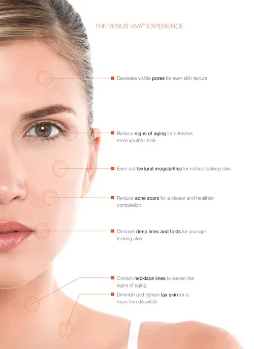 Venus Viva™ is an advanced, non-surgical solution for skin resurfacing that works to improve the overall texture of your skin. It combines NanoFractional Radio Frequency (RF) and SmartScan™ technology to help you get smoother, healthier skin by reducing signs of skin damage, including scars, enlarged pores, stretch marks, wrinkles, rosacea, and any other skin conditions that affect the texture of your skin.