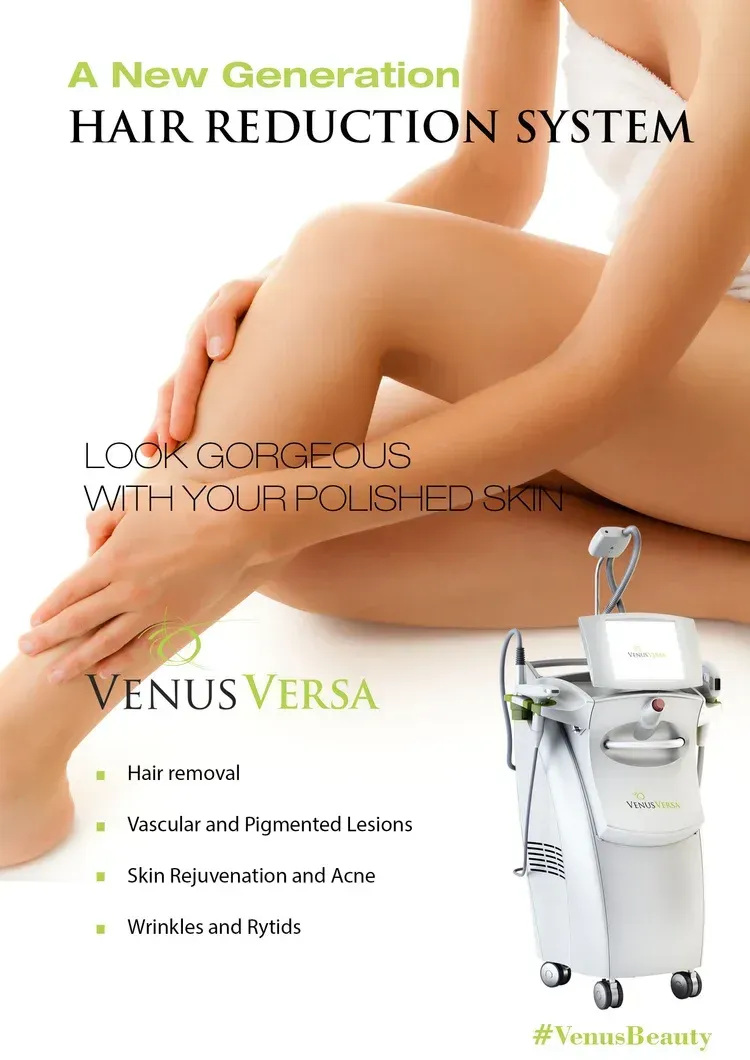 The Venus Versa is the latest technology in Intense Pulsed Light combination machines, incorporating "Smart Pulse" which ensures precise and consistent energy delivery to the chosen target. It does several different aesthetic treatments, including benign pigmented epidermal and cutaneous lesions, (think brown spots or age spots). It is also works wonderfully for the treatment of benign cutaneous vascular lesions, and the removal of unwanted hair, and to effect stable long-term or permanent hair reduction.